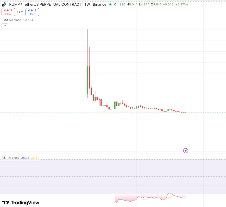 At the time of reporting, $TRUMP is trading around $4.9. Market watchers note that the token has been making new lows almost daily, with no clear historical support levels to lean on.